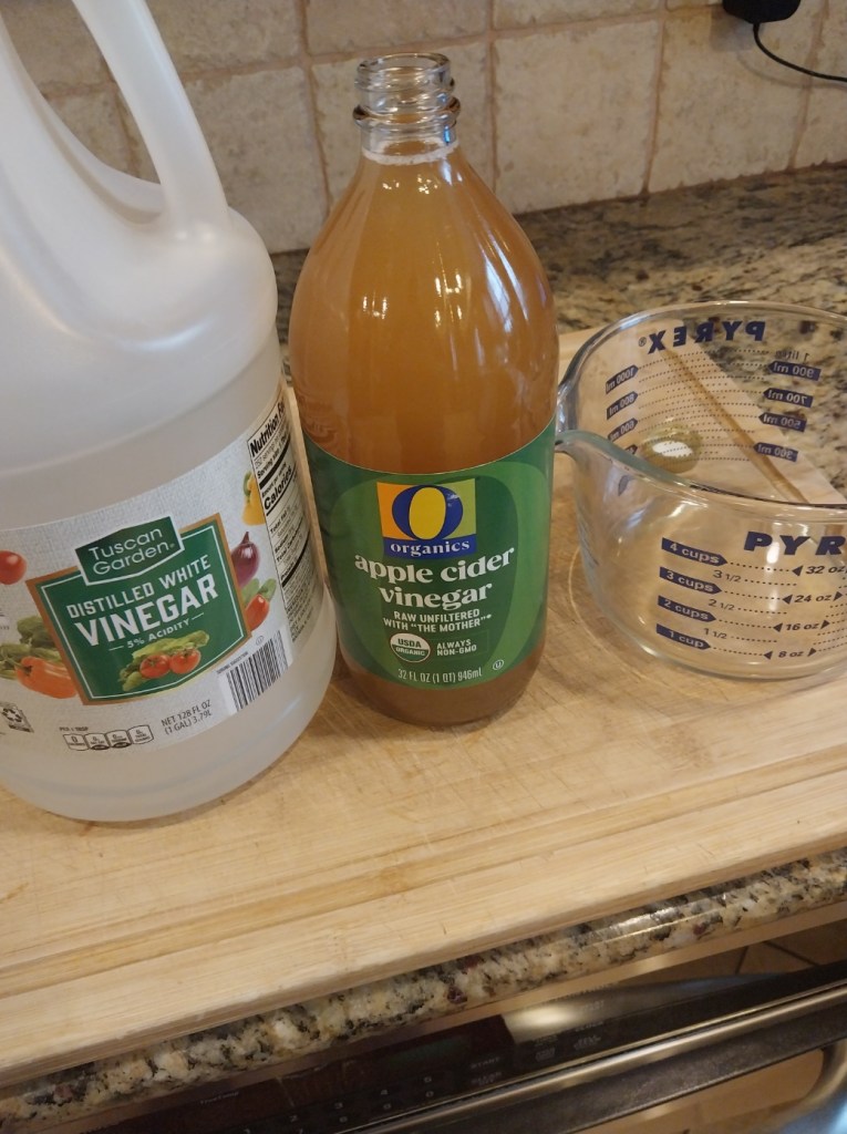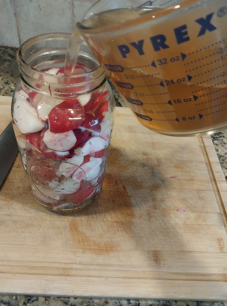 - Fill small stock pot with white and apple cider vinegar, salt and sugar, and heat, stirring to dissolve. Take to a boil then turn off.