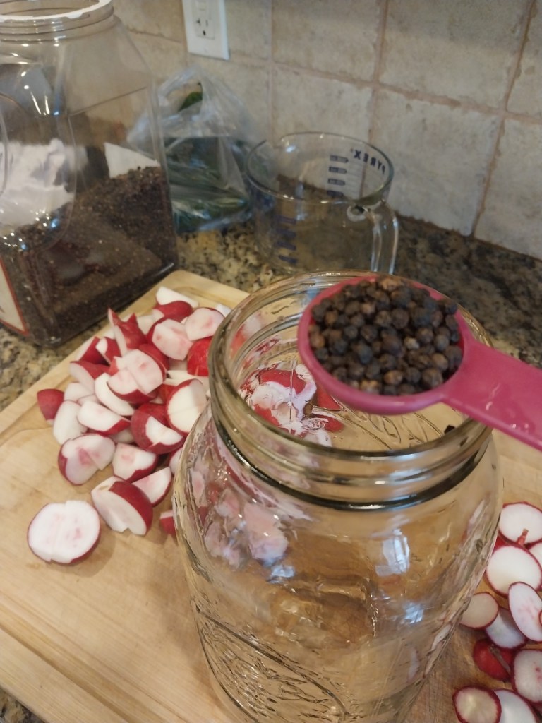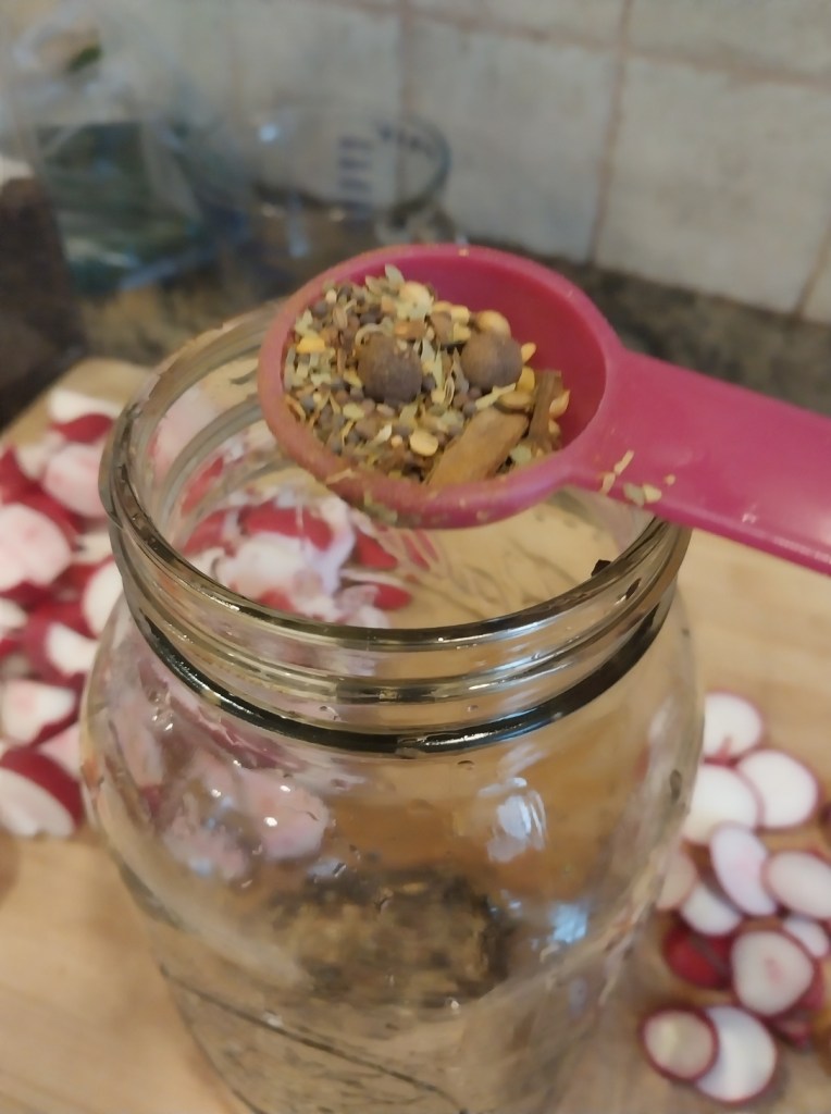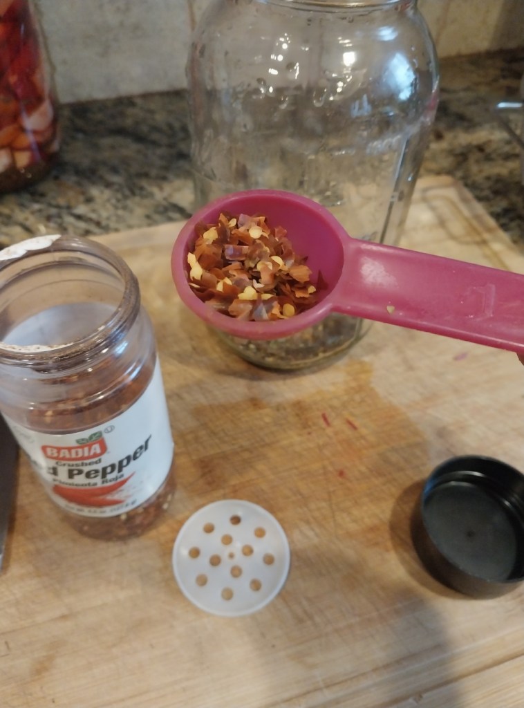 - Fill jar with black peppercorns, pickling mix and red pepper flakes (or hot pepper of your choice).