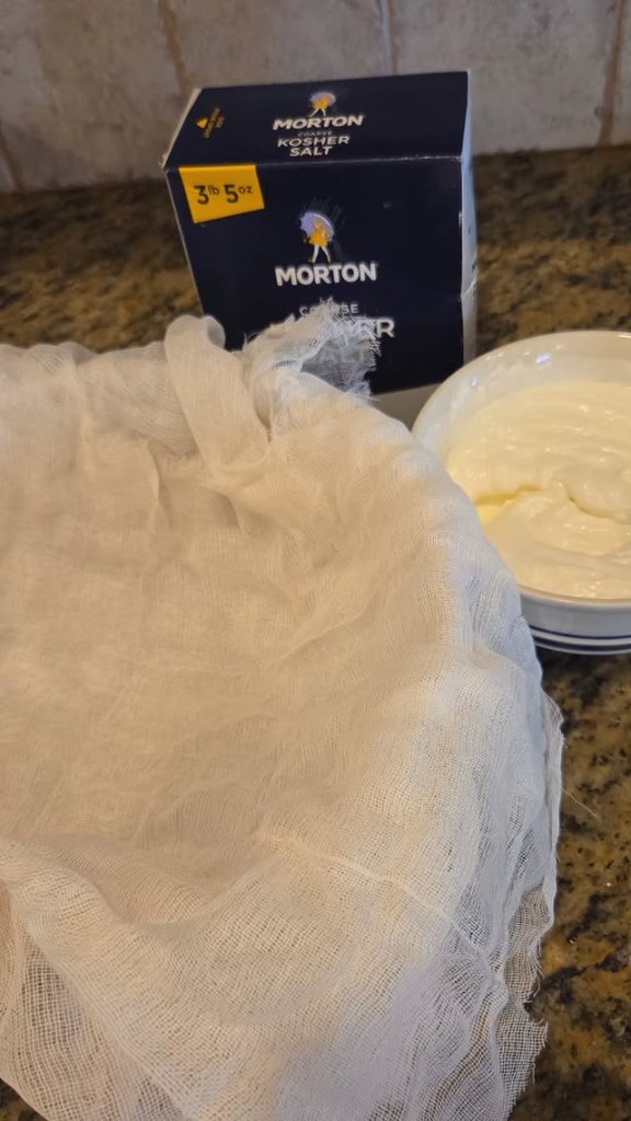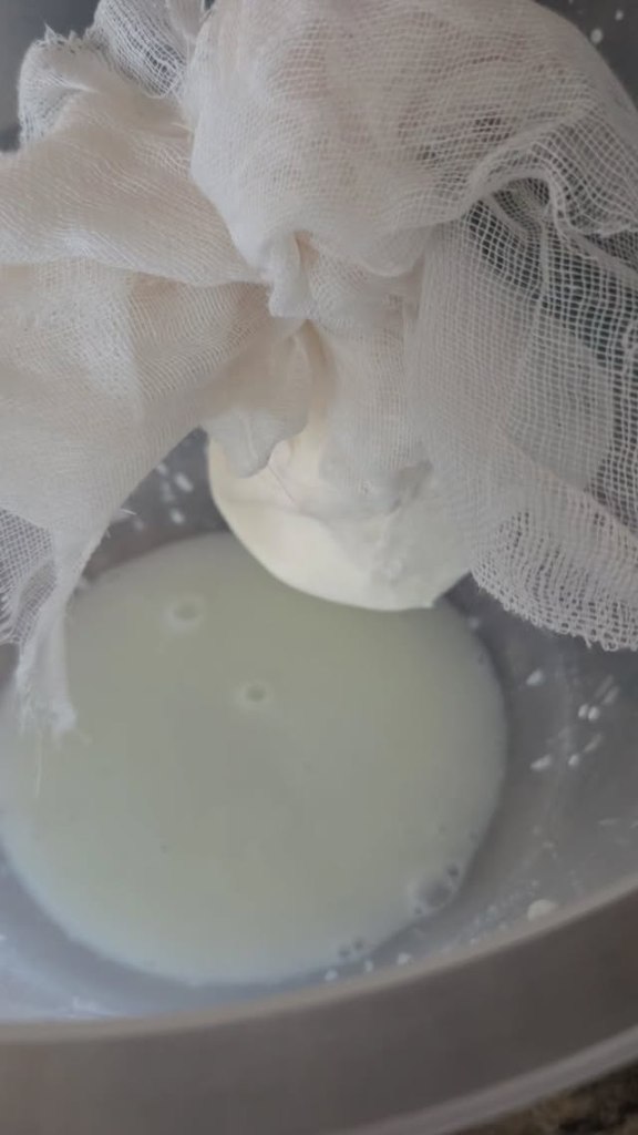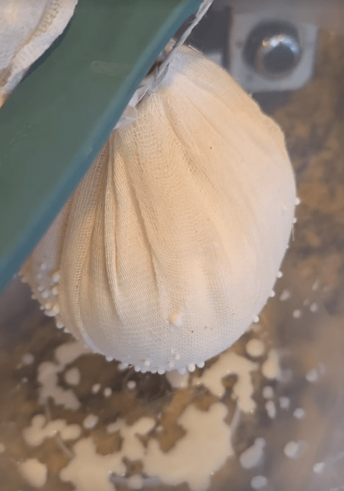 That’s it. No fancy equipment needed. I use cheese cloth for mine but you can simply put yours in a strainer or a colander lined with a paper coffee filter or the like.