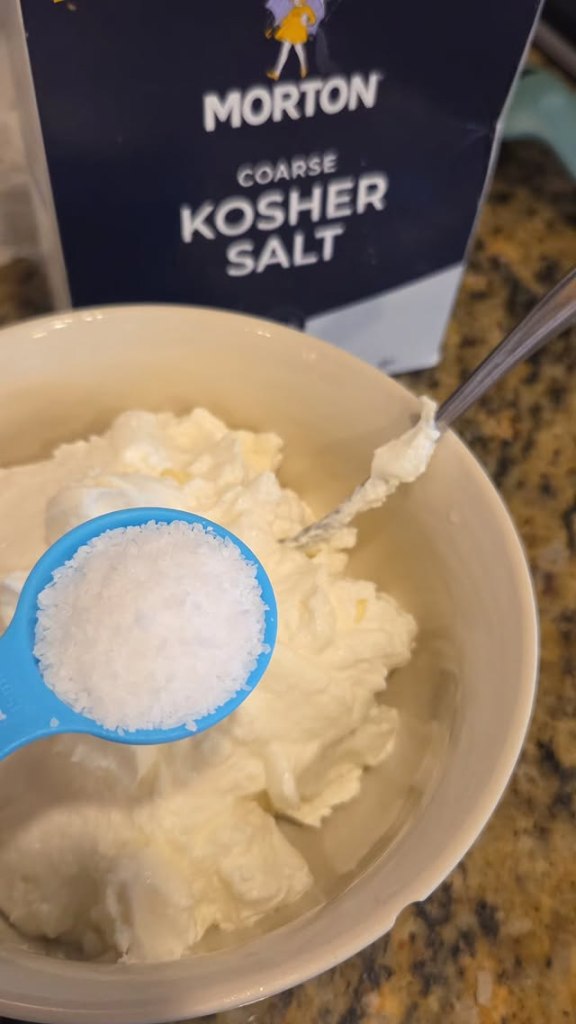 - It is ideal to use whole milk Greek yogurt as this is the thickest available. Low fat or non-Greek yogurt will not give you the results you seek. Stir together the yogurt and salt, mixing them in a bowl.