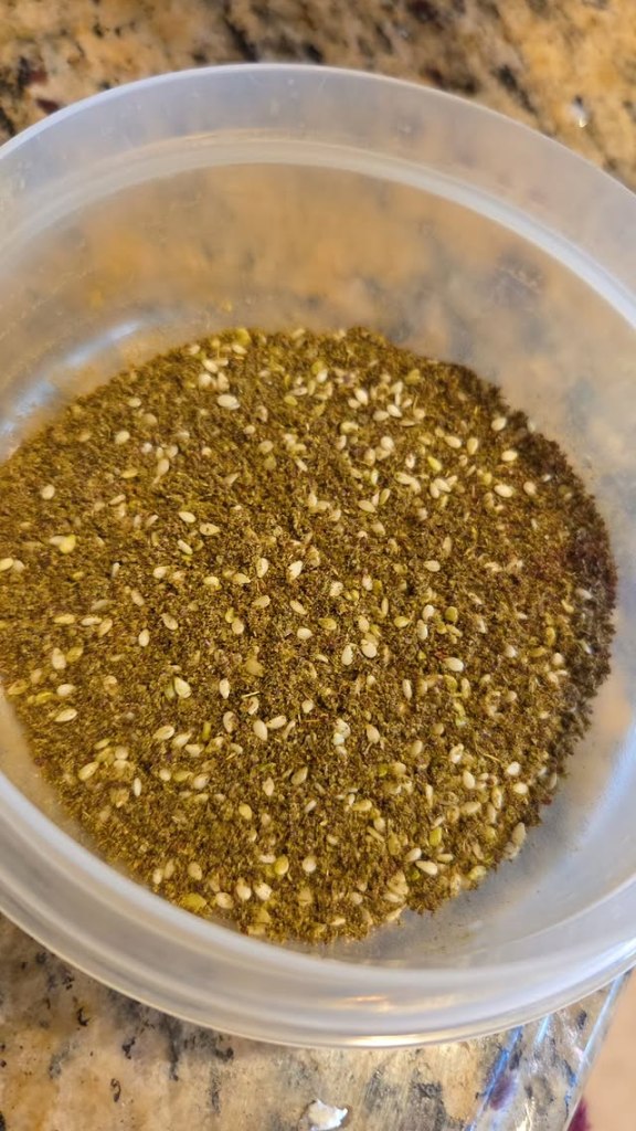 - Prepare your spices in a small bowl. I used za’atar mixed with sumac, about 3 parts to 1.
