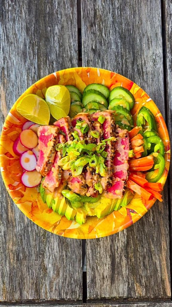 - Place rice on base of serving dish. Add your accoutrements as you want and layer the sliced tuna on top