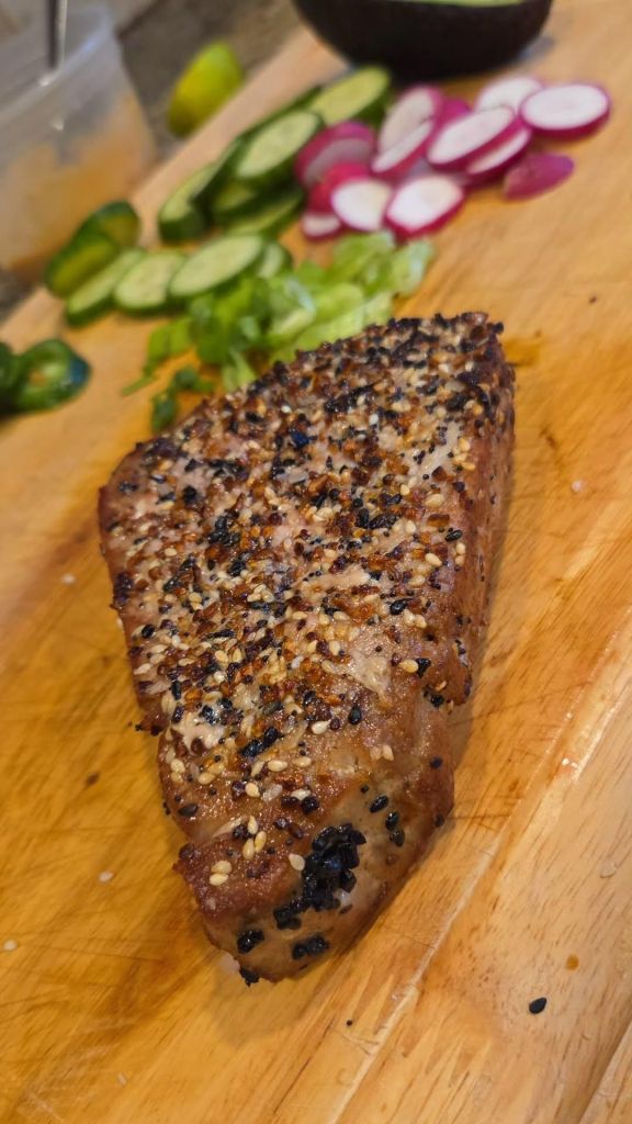 - Remove tuna steak and coat both sides with everything seasoning