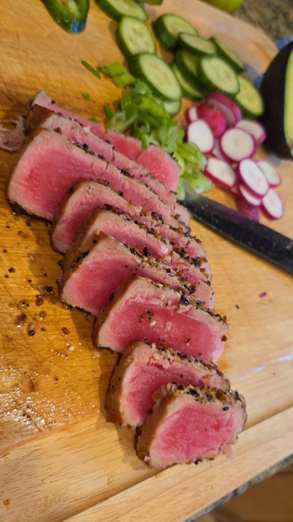 - One frozen then mostly thawed tuna steak (see note above)