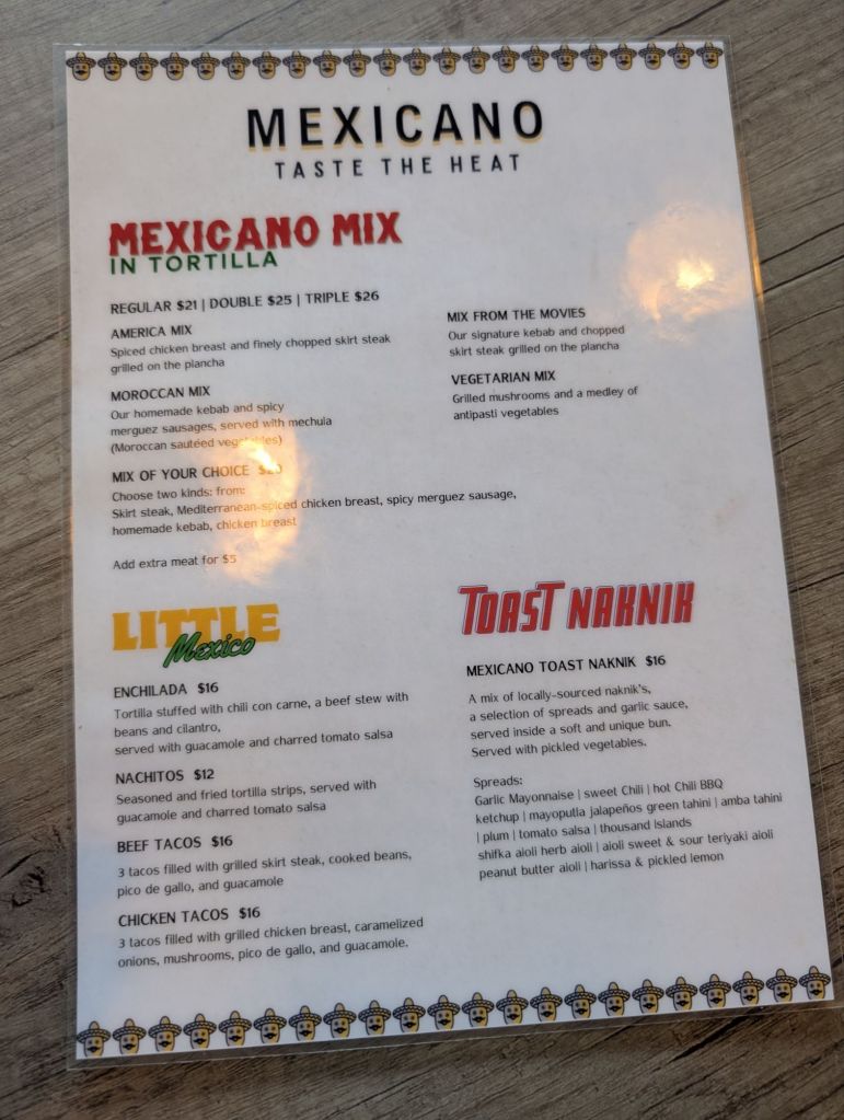 Mexicano doesn’t really have much signage on the outside yet, but it’s easy enough to find if you know where Pizza TLV was, and it’s right next to Oh Mama Kitchen (which I still haven’t been to yet, oddly enough). Going inside, it’s well-lit, with nice furniture, and a pleasant, but somewhat austere aesthetic. It’s early days, but this is a nice start.