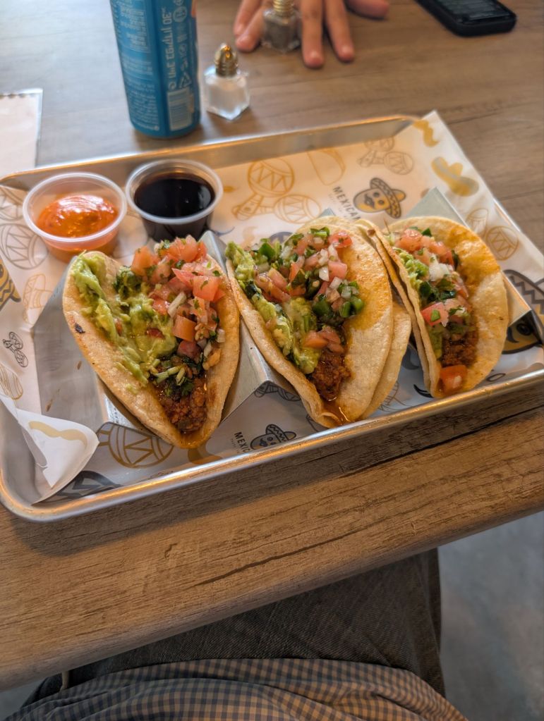 We decided on the enchiladas, beef tacos, and the Americano mix in a tortilla, along with a large side of the seasoned fries. Fleishig Mexican food is not something I’ve had in quite a while, and the kids were interested in trying it.