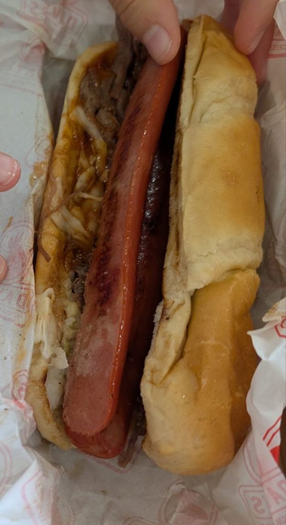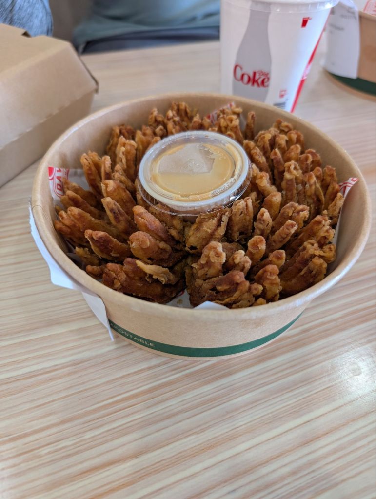We ordered the Loaded Hot Dog, the Pulled Beef sandwich, and the Southern Fried Chicken sandwich, along with a Blooming Onion and some drinks. Total was ~$73, which isn’t cheap, but is more or less the new normal these days.