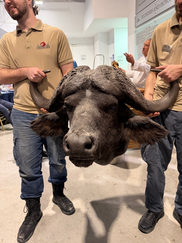 Suddenly, the build-up music began and the assistants brought out the humongous head of a taxidermied Asian Water Buffalo! Slifkin explained that the American buffalo is also known as bison and while they are both in the same family, there are differences.