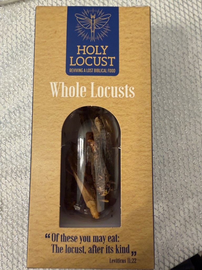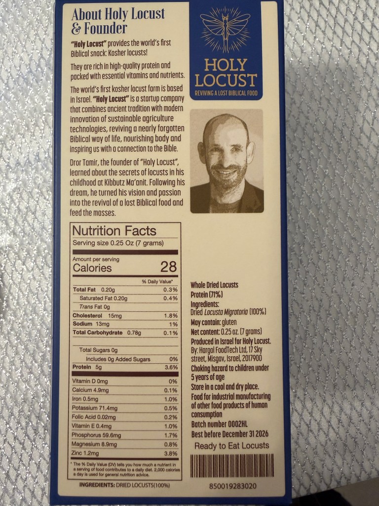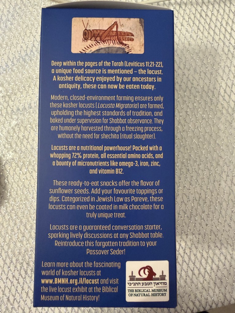 As it pertains to kosher, apparently there are certain types of locusts that are kosher and spoken about in the Torah and therefore permitted. As such, I was able to enjoy. With that said, these locusts were covered in a flavored crispy something. I can see why people would eat them. They’re like air popped popcorn shaped like locusts. The taste is earthy, crunchy and dry. Not flavorful but not offensive either. Just something you might eat while you’re not thinking about eating an insect. Maybe while watching a football game. Maybe you dip them in cheese sauce or melted chocolate. Get creative should you choose but they definitely need a little something.