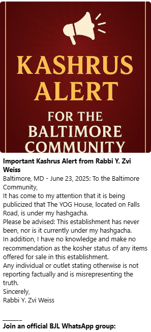 Important Clarification: The YOG House, Baltimore, Not Under Kosher Supervision